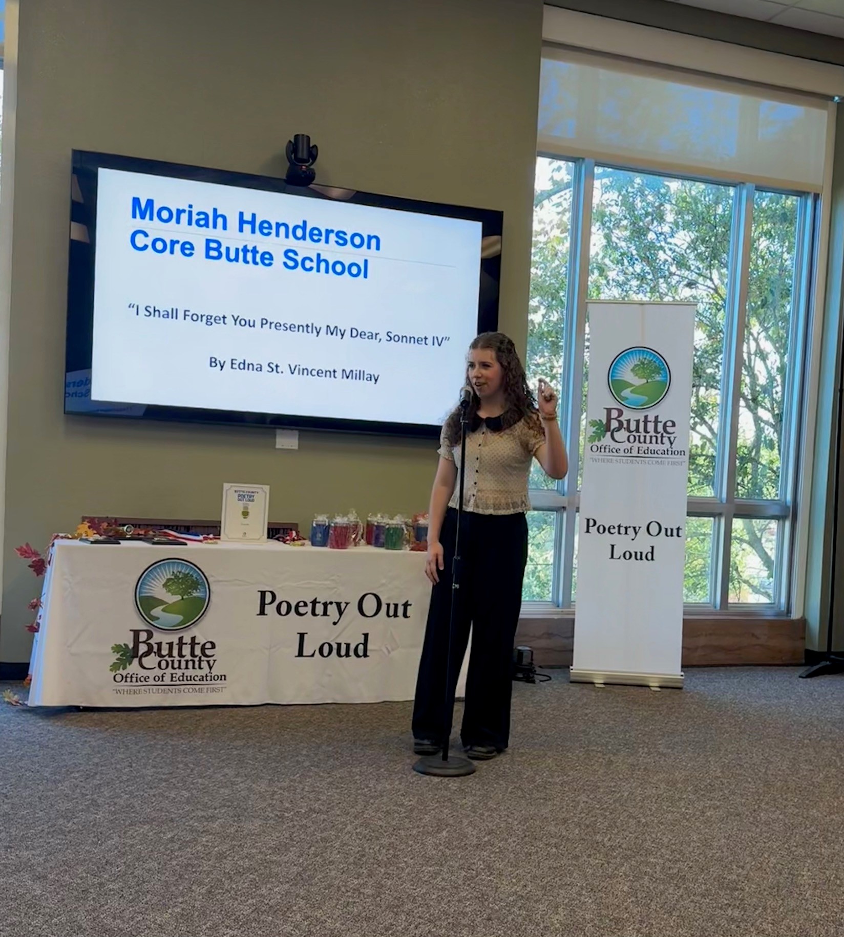 Moriah Henderson representing Core Butte Charter School won first place in 2025/2026 Butte County Poetry Out Loud Competition.